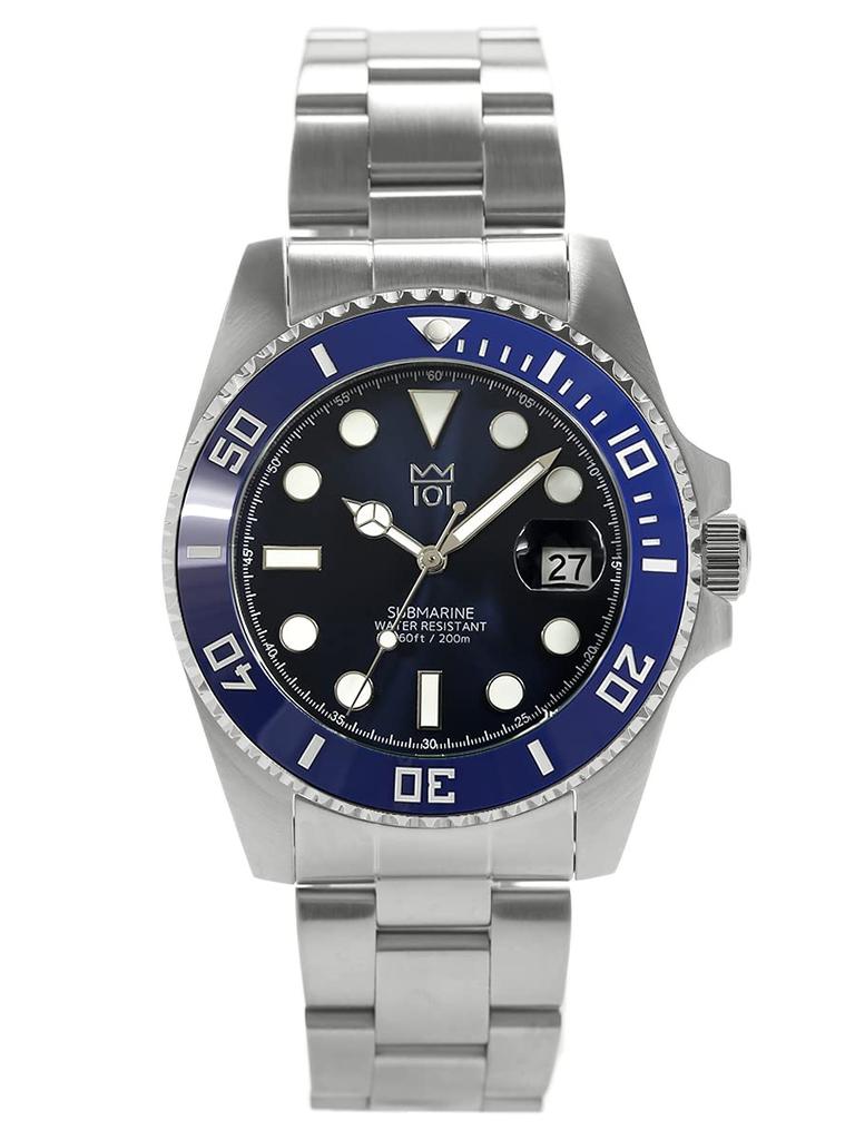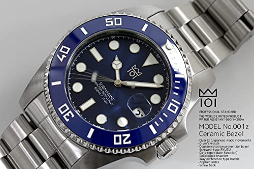 Водонепроницаемые часы 20 ATM с керамическим безелем и календарем, металлический ремешок x [HYAKUICHI 101] Мужские дайверские часы (Синий Синий)
