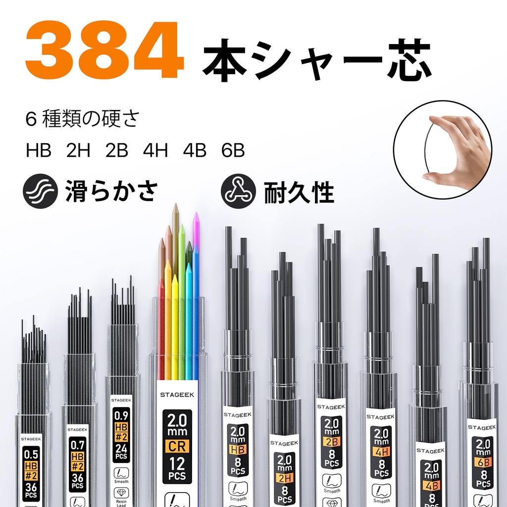【4 типа ширины линии и 6 типов твердости】Этот набор механических карандашей включает в себя 4 типа стержней для линий разной ширины.: 0,5/0,7/0,9/2,0 мм, графит 2,0 мм Карандаш поставляется со стержнями 6 различных степеней твердости. (6Б, 4Б, 2Б, НВ, 2Н, 4Н), позволяя создавать различные плотности. Идеально подходит для повседневного использования, пишет плавно и не ломается.