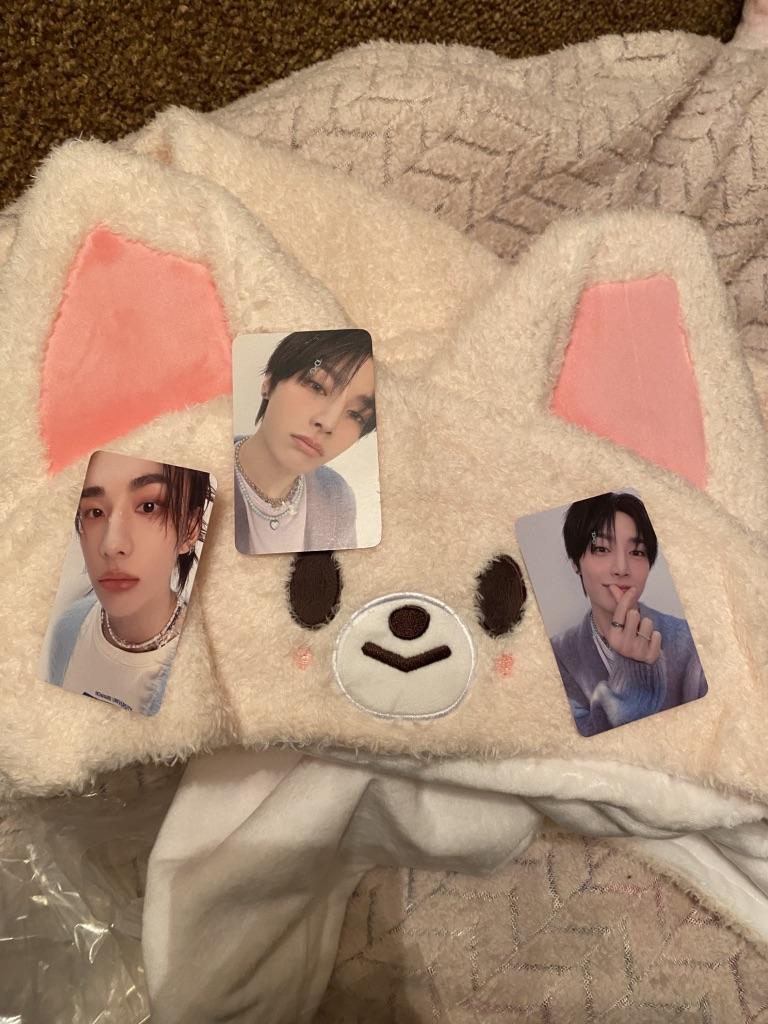 Не думала, что уши такие большие будут, а в целом плед милый, мягкий, просто супер) еще и две карточки с чонини и одна с хенджином💕