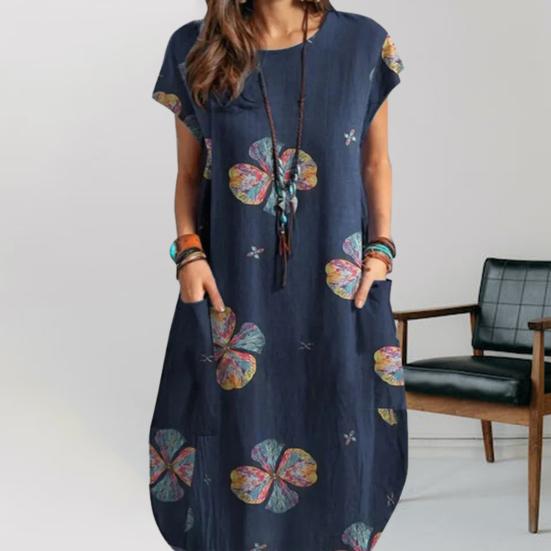 Представляем наше стильное и модное женское платье, идеально подходящее для летнего сезона! Это платье с короткими рукавами, круглым вырезом и привлекательными принтами, которые продемонстрируют ваше очарование моды и сделают вас центром внимания, куда бы вы ни пошли. Ретро-принт добавляет нотку элегантности и веселья в общий образ, а дизайн платья делает его простым, но изысканным. Это платье, изготовленное из высококачественного хлопкового льна, обладает превосходной эластичностью, обеспечивая удобную и дышащую посадку в течение всего дня.
