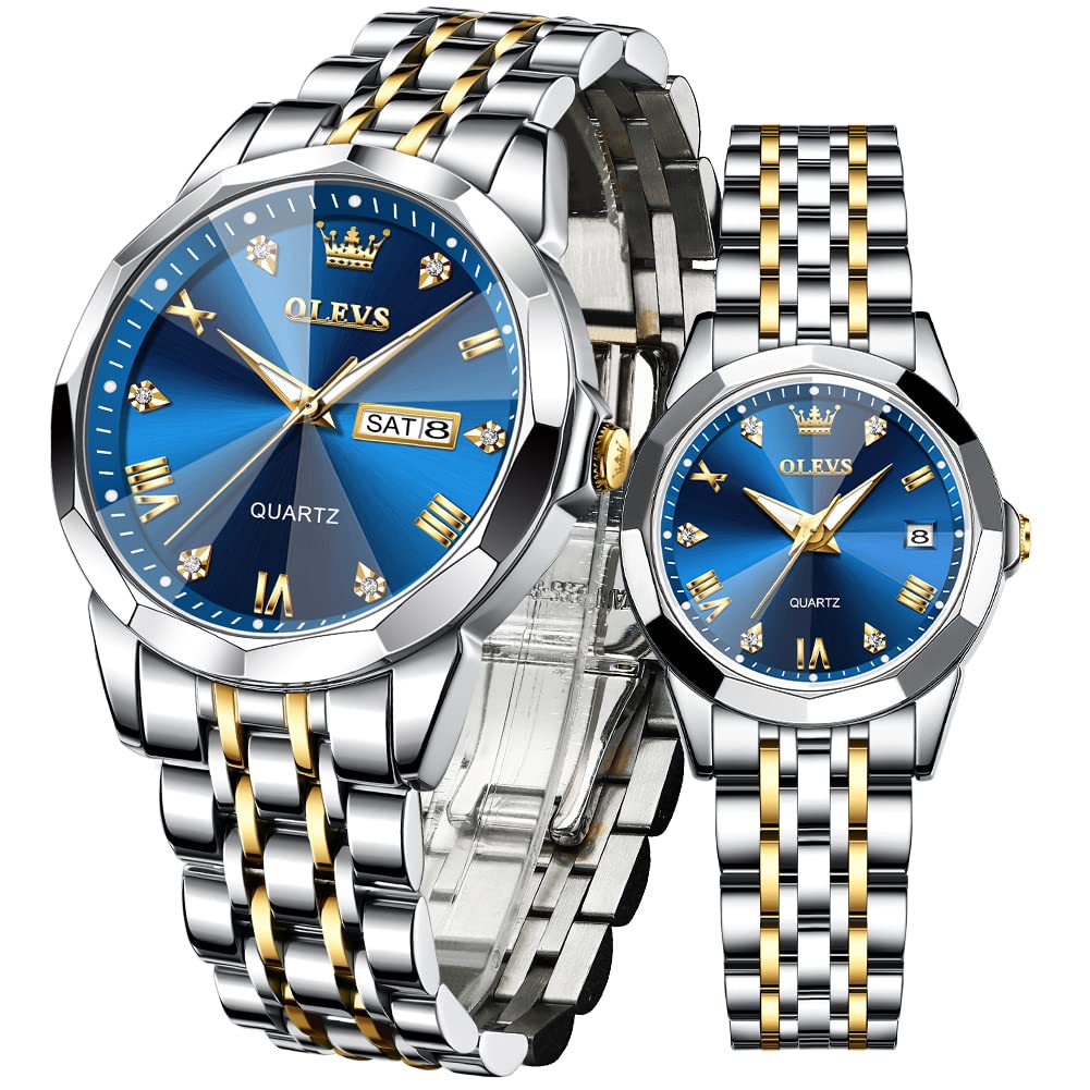 OLEVS Парные часы Популярные парные часы Кварцевые бриллиантовые нержавеющая сталь Водонепроницаемые Дата Светящиеся белые Подарочные часы для пары подарочный набор (синий)