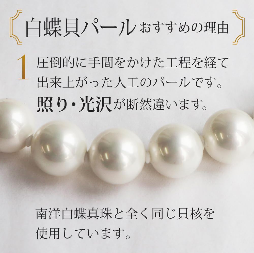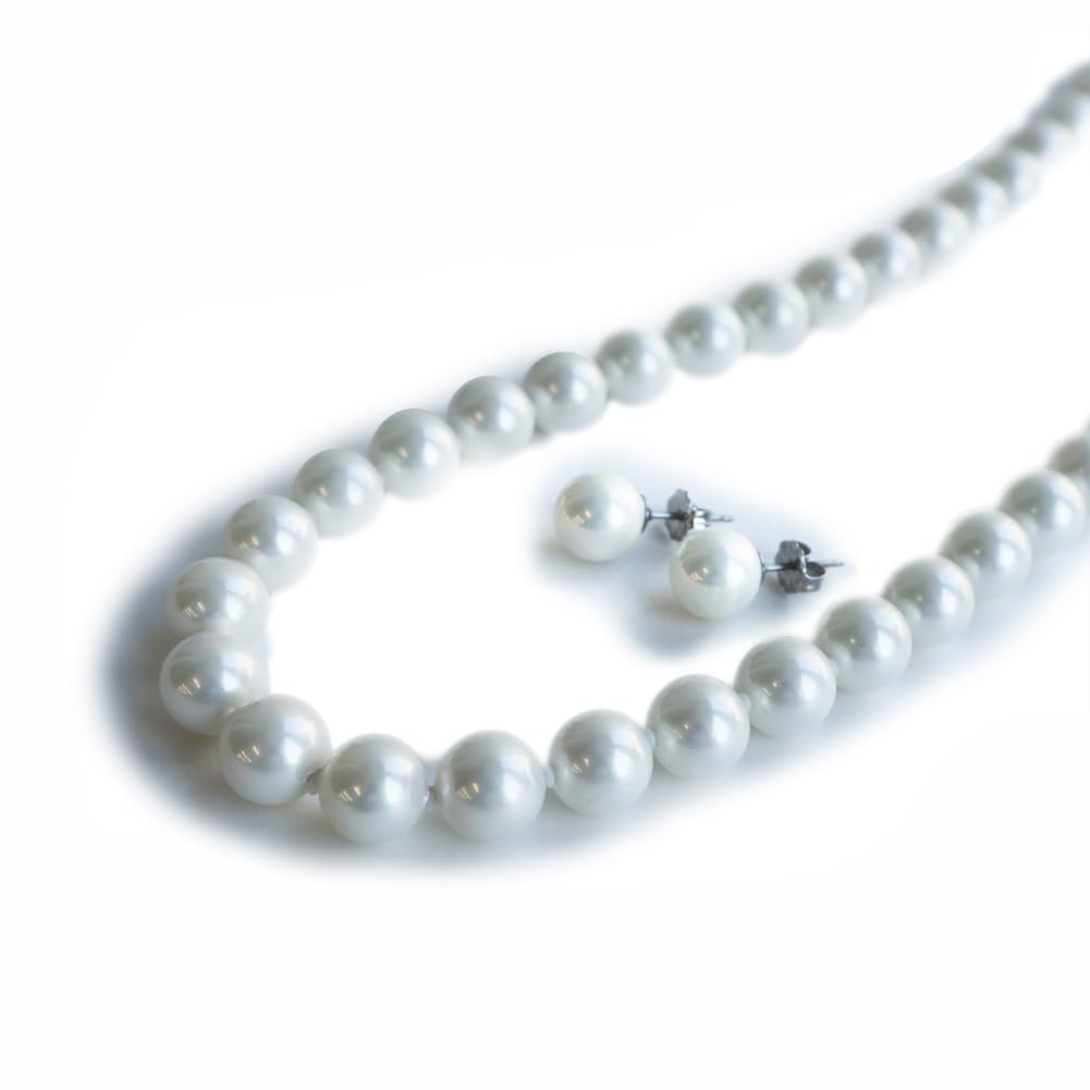 В жемчужном ожерелье используются сердцевины ракушек, которые в точности соответствуют настоящим, и оно точно воспроизводит текстуру, вес и, что самое сложное, блеск и цвет белого жемчуга Южного моря!