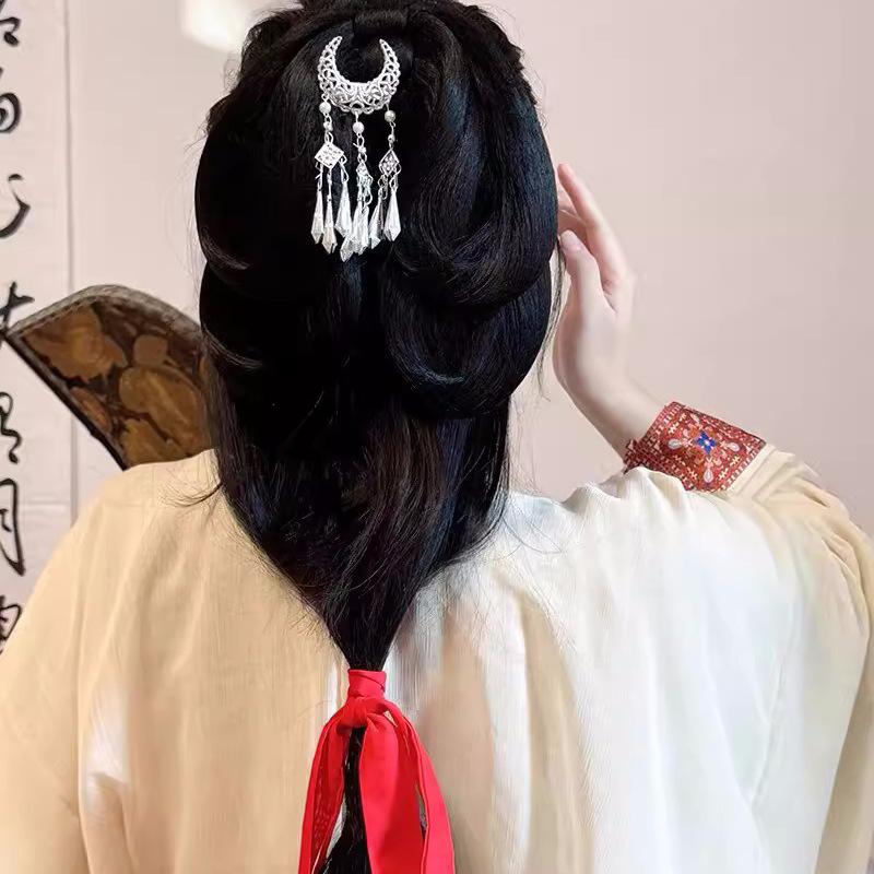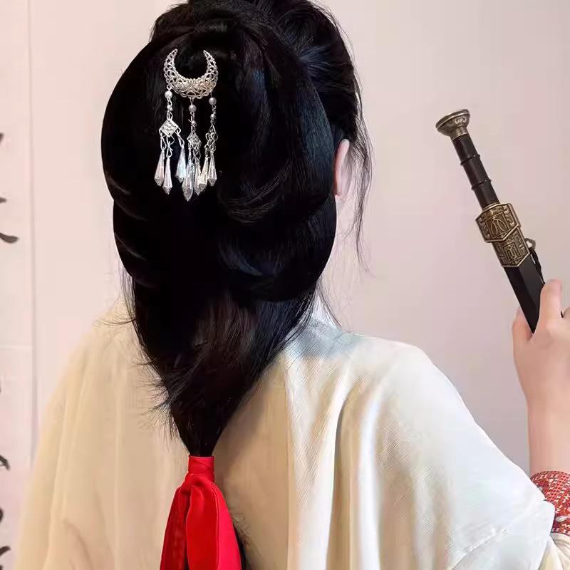 Древний головной убор имитация мяо серебряный полумесяц кисточка шпилька фея шагающая супер фея древний костюм воюющих царств халат аксессуары шпилька
