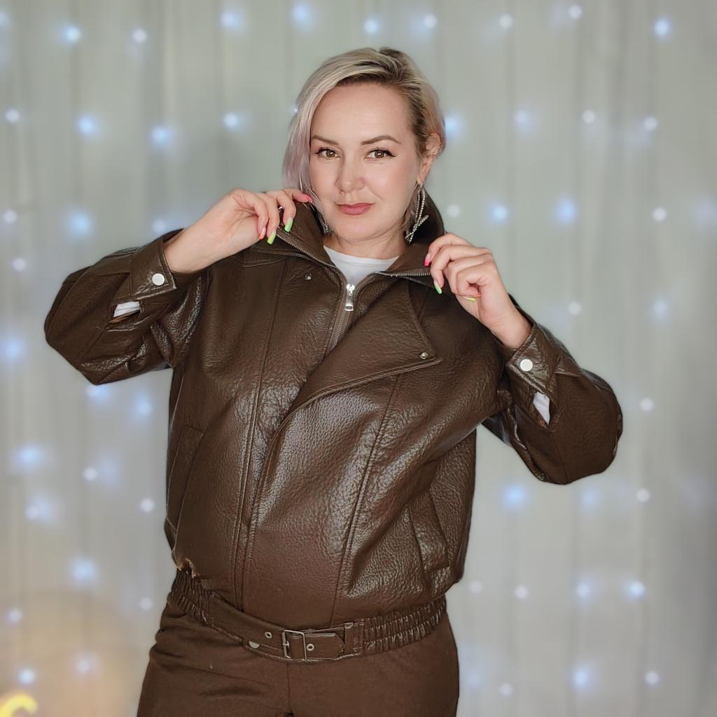 Чумачечья куртка косуха в шоколадном цвете. Любовь, любовь, любовь! Офигенная куртка с иммтацией грубой выделки кожи. Попала в самое сердечко, а лучше сказать в самый топ! Ткань: Плотная ПУ кожа с крупным характерным рисунком грубой кожи. Не смотря на грубость кожи и возможно кажующуюся тяжесть, куртка в меру лёгкая. Внутри подкладка. Дизайн: Куртка застегивается на молнию имеет двойной воротник очень интересная деталь. Есть карманы. По низу широкая резинка с боков + короткий ремень. Размер: На мне L Мои параметры : рост 172 см 98/86/106 см Детали : Длина 67 см Длина рукава 72 см Плечи нет ОГ 120 см ОТ 116 см ОБ 100 до 120 см Резюмирую: На осень - весну просто идеальный вариант. Классная, качественная, стильная - что уж там она идеальная! Рекомендую 👍 Я не прощаюсь, M_K #коричневая_косуха