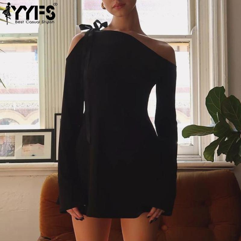 YYFS Женская мода весна осень однотонный принт длинный рукав косой воротник высокая талия повседневные платья