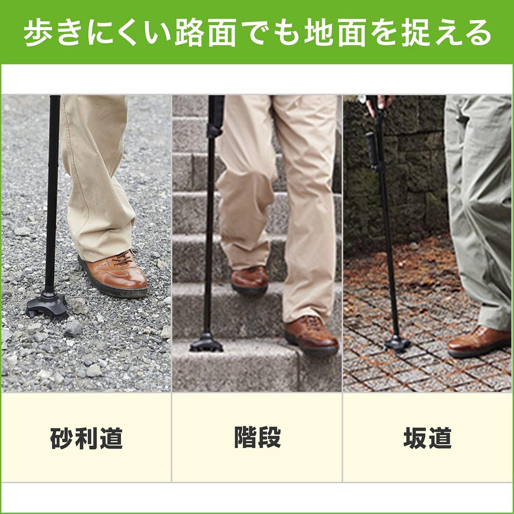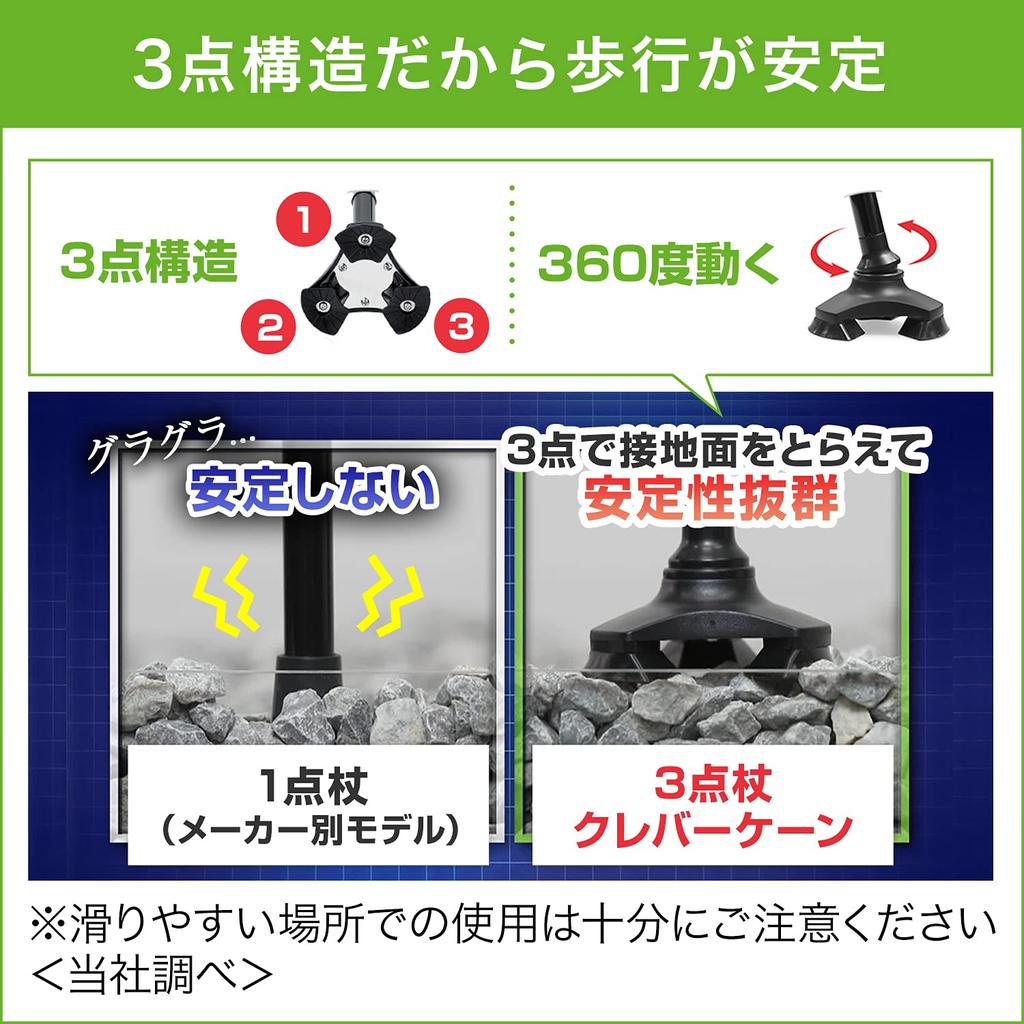 Трехточечная конструкция делает ходьбу более устойчивой и обеспечивает чувство безопасности за счет трех точек опоры вместо одной.. Самой привлекательной особенностью Clever Cane является ее устойчивость, поддерживаемая тремя точками. Даже если трость с одной точкой опоры имеет небольшую площадь опоры и ее трудно стабилизировать, трость с тремя точками опоры поддерживает ее на более широкой площади, что делает ее чрезвычайно устойчивой.. Более того, он вращается на 360 градусов, что позволяет ему надежно сцепляться с землей даже на сложных для ходьбы поверхностях.. Вы можете уверенно ходить по склонам, склоны которых склонны к обвалу, по мокрым и скользким лестницам, а также по гравийным дорогам, на которых может быть много гальки.