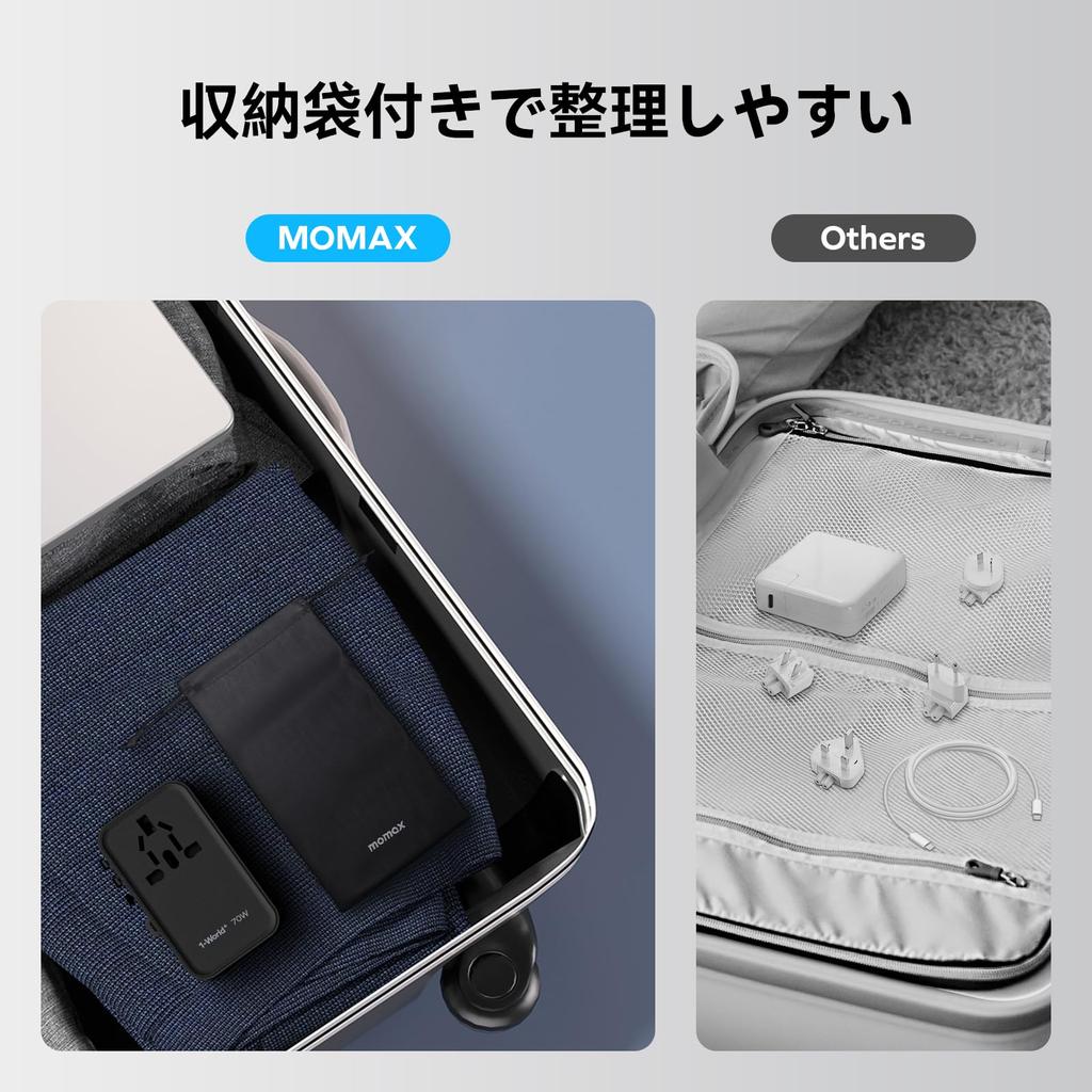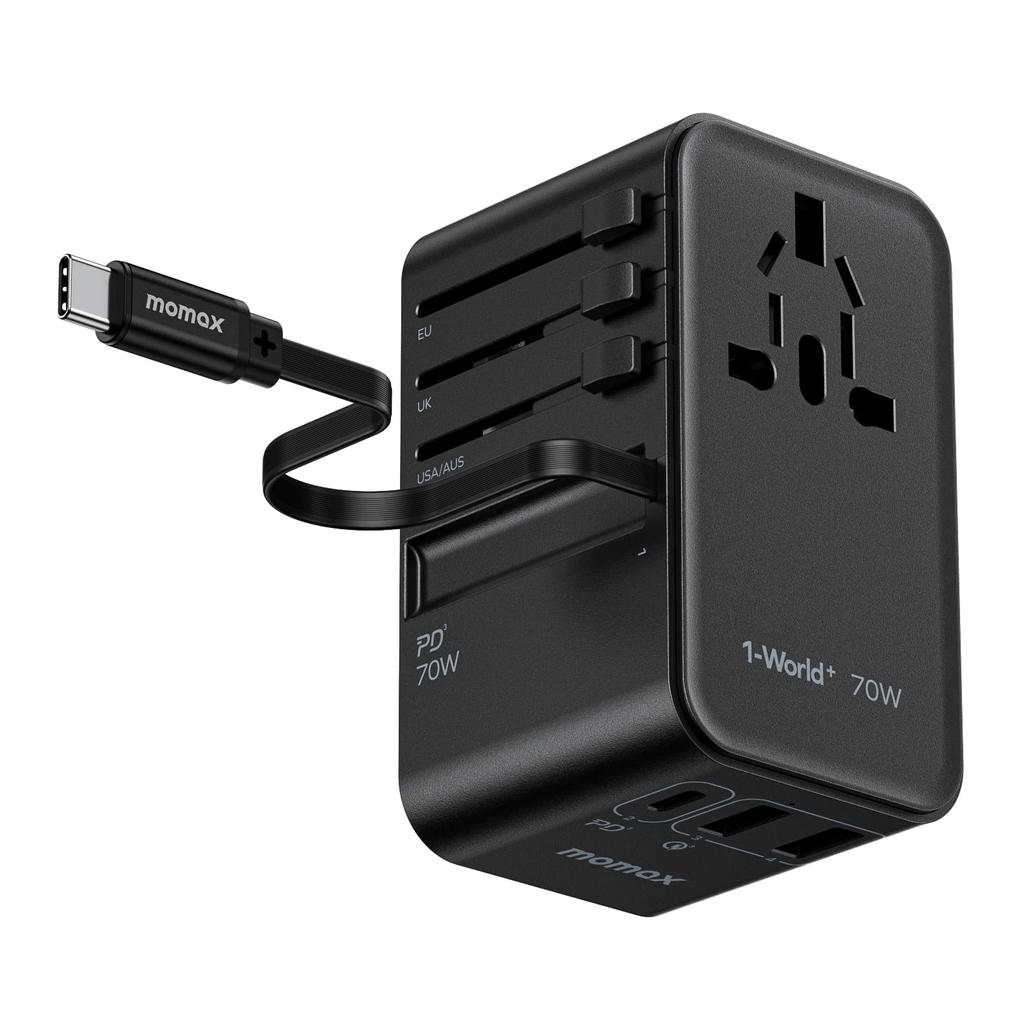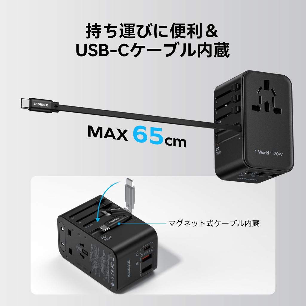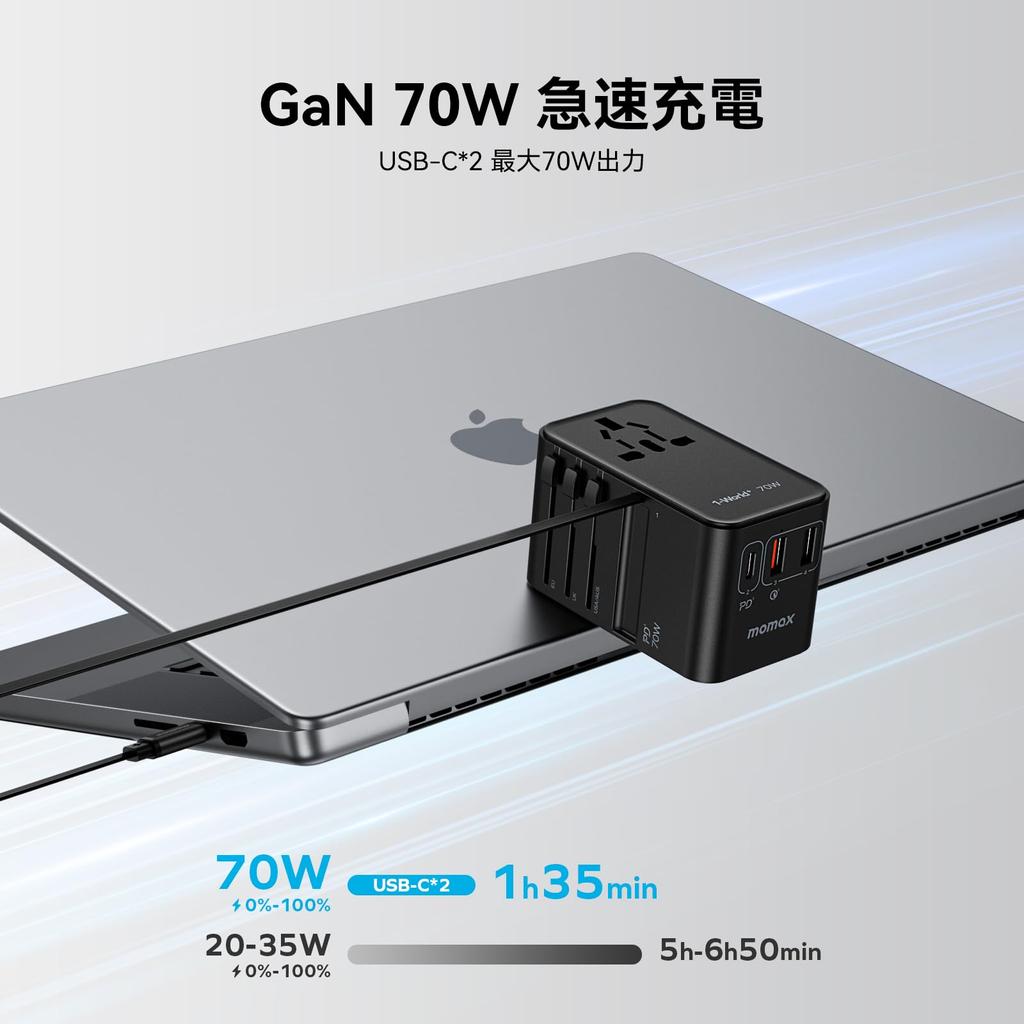 [PD GaN 70 Вт, быстрая зарядка и усовершенствованная технология GaN] Оснащен кабелем USB-C x 1, портом USB-C x 1, портом USB-A x 2, розеткой переменного тока x 1 (максимум 2500 Вт), PD3.0 и QC3.0 Это переходник для использования за рубежом, поддерживающий быструю зарядку.. Одновременно можно заряжать до 5 устройств.. Как порт USB-C, так и кабель USB-C могут достигать невероятно высокой скорости PD 70 Вт.. Передовая технология GaN от MOMAX также позволяет сделать этот адаптер-преобразователь невероятно компактным и легким, обеспечивая более быструю зарядку и более низкие температуры.