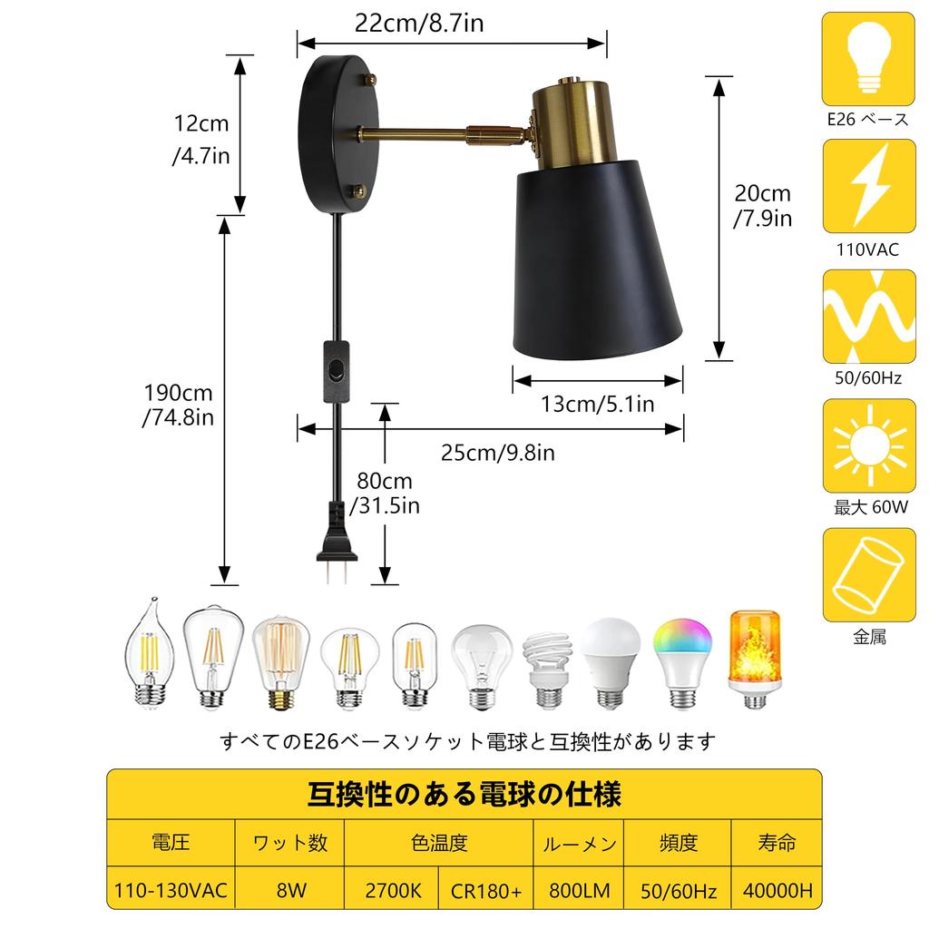【Размер】Размеры: Этот светильник оснащен цоколем E26, который подходит для различных типов лампочек мощностью до 60 Вт.. Размеры: ширина 22 см/8,7 дюйма, высота 20 см/7,9 дюйма, регулируемая длина провода 190 см/74,8 дюйма, диаметр основания лампы 12 см/4,7 дюйма.