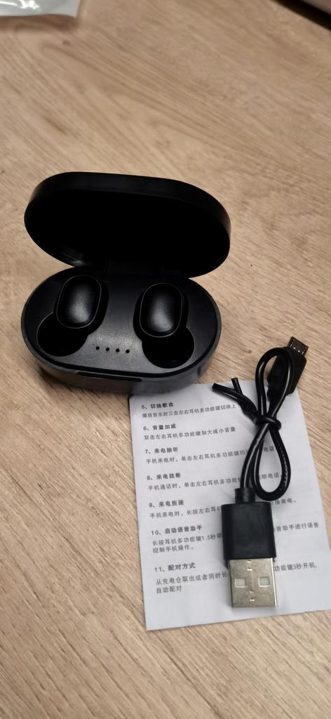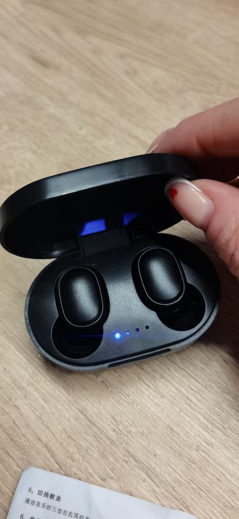 Беспроводные бюджетные блютуз наушники. Наушники пришли заряженные, подключились через блютуз быстро. Наушники в ушах держатся хорошо. Крышка кейса защелкивается. На кейсе видно уровень заряда. Для прослушивания музыки зарядки хватает на 2 часа. В комплекте: Наушники. Кабель для зарядки кейса. Звук в наушниках хороший. Заказом довольна. Всем удачных покупок.
