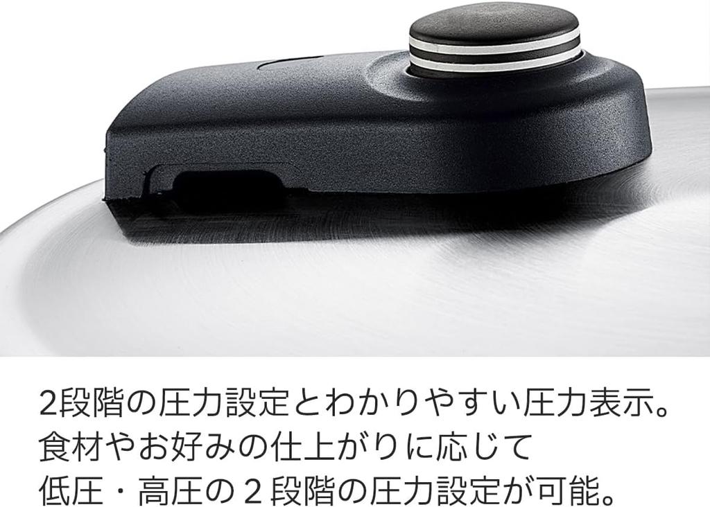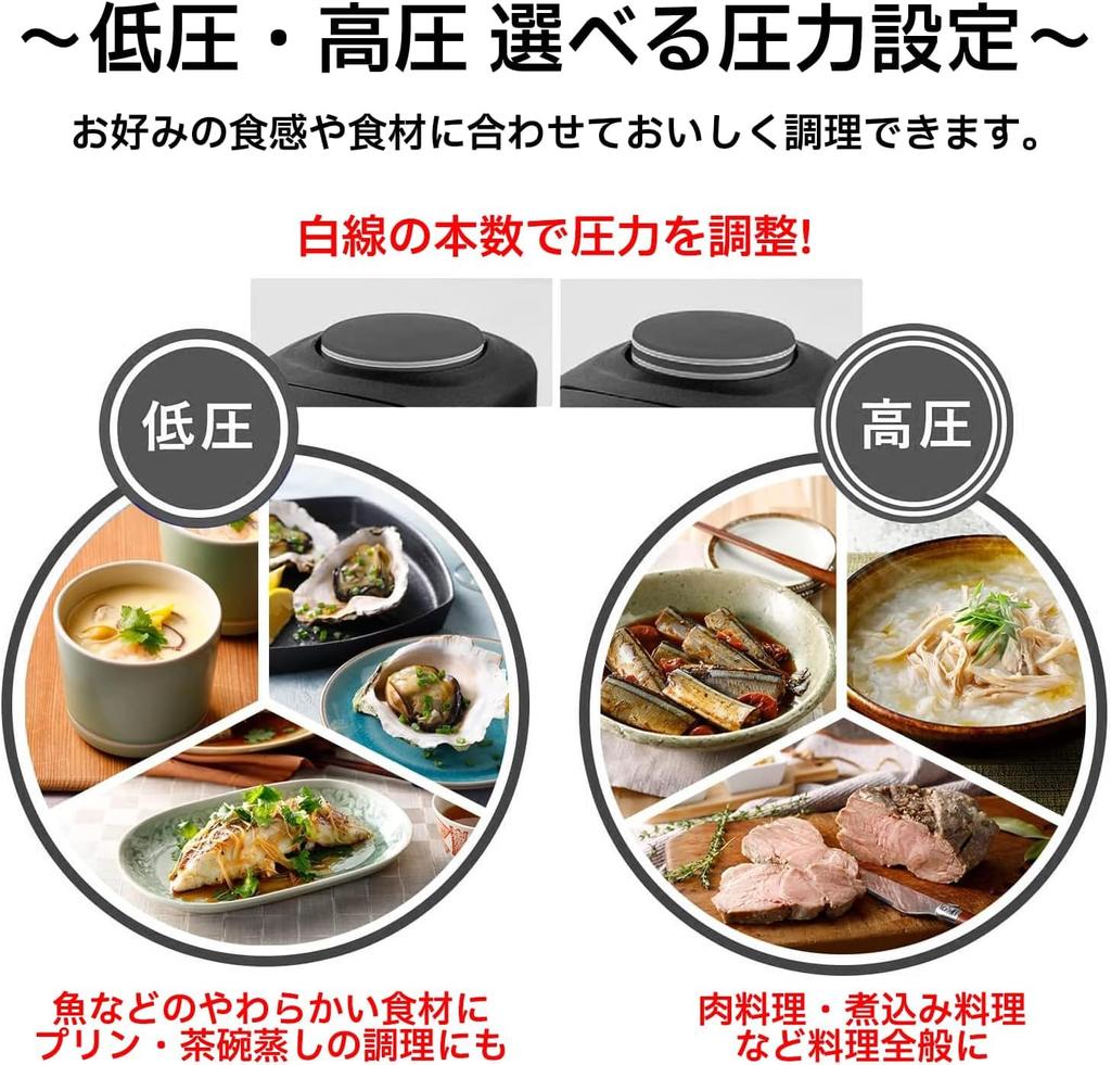 [Двухступенчатая настройка давления] В зависимости от ингредиентов и желаемого результата возможны двухступенчатые настройки давления: низкое и высокое.. Низкое давление подходит для приготовления мягких блюд, таких как рыба, пудинги и заварные яйца на пару, а высокое давление подходит для обычной готовки, например, мясных блюд и рагу.