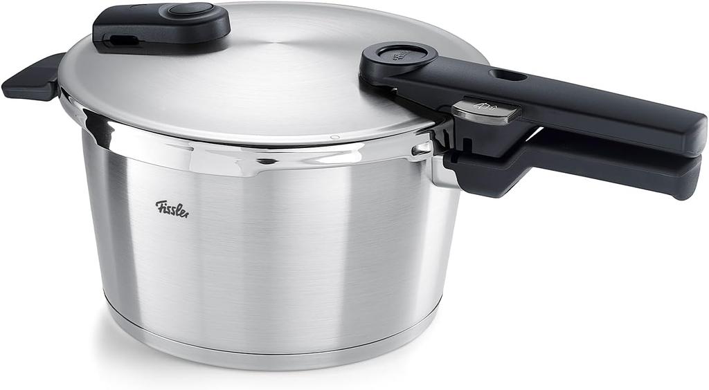 [Дизайн] Скороварка Fissler с низким уровнем пара и тихим шумом. Технические характеристики безопасности, исключающие возможность приложения давления без надлежащей фиксации, дополнительная ручка большего размера и более удобная для захвата, а также красивый корпус из высококачественной нержавеющей стали с сатинированной отделкой.