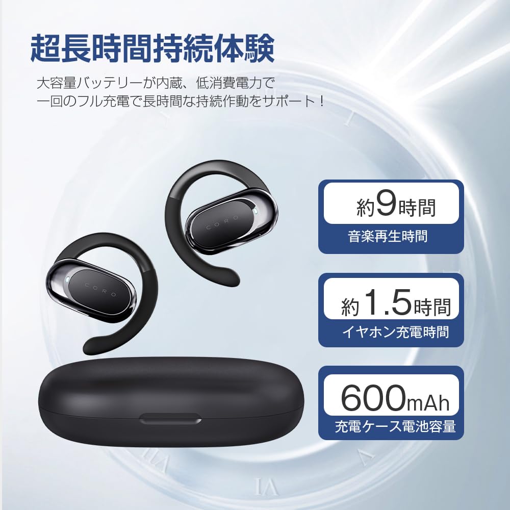 [Другие особенности] ① Оснащены заушными крючками, которые можно отрегулировать под углом 90°, что обеспечивает надежную посадку и стабильное ношение. ②Вес одного наушника всего 9 г, поэтому вы не устанете даже при длительном ношении.. ③Большая емкость аккумулятора + низкое энергопотребление обеспечивают длительную работу. ④ Повседневный уровень водонепроницаемости, защита от пота и капель.