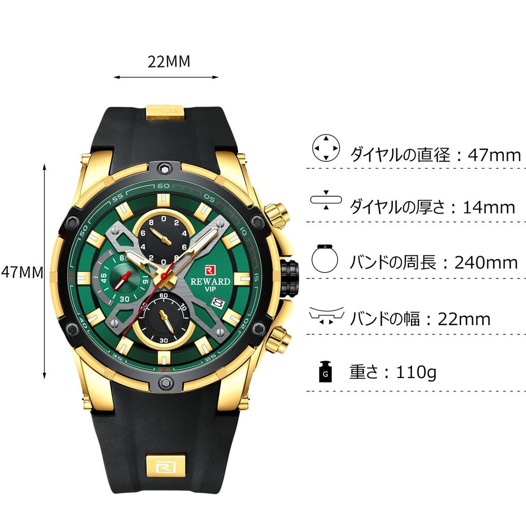 [Характеристики] ★Диаметр циферблата: 47мм, толщина корпуса: 14 мм, ширина полосы: 22 мм, окружность ремешка: 240мм, вес: 110г. Силиконовый ремешок, водонепроницаемость 30 м, аналоговый дисплей, отображение даты, хронограф, функция подсветки. ★Содержимое набора: Основной блок *1, изысканная подарочная коробка *1, руководство по эксплуатации на японском и английском языках *1.