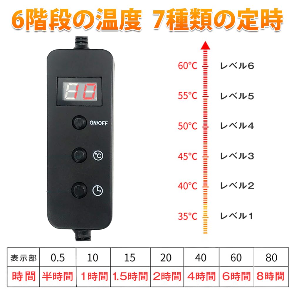 Легко работать: Благодаря 6 температурным режимам на пульте дистанционного управления вы можете свободно регулировать комфортную температуру от 35℃ до 60℃.. Кроме того, он полон продуманных таймеров на 0,5 часа, 1 час, 1,5 часа, 2 часа, 4 часа, 6 часов и 8 часов.