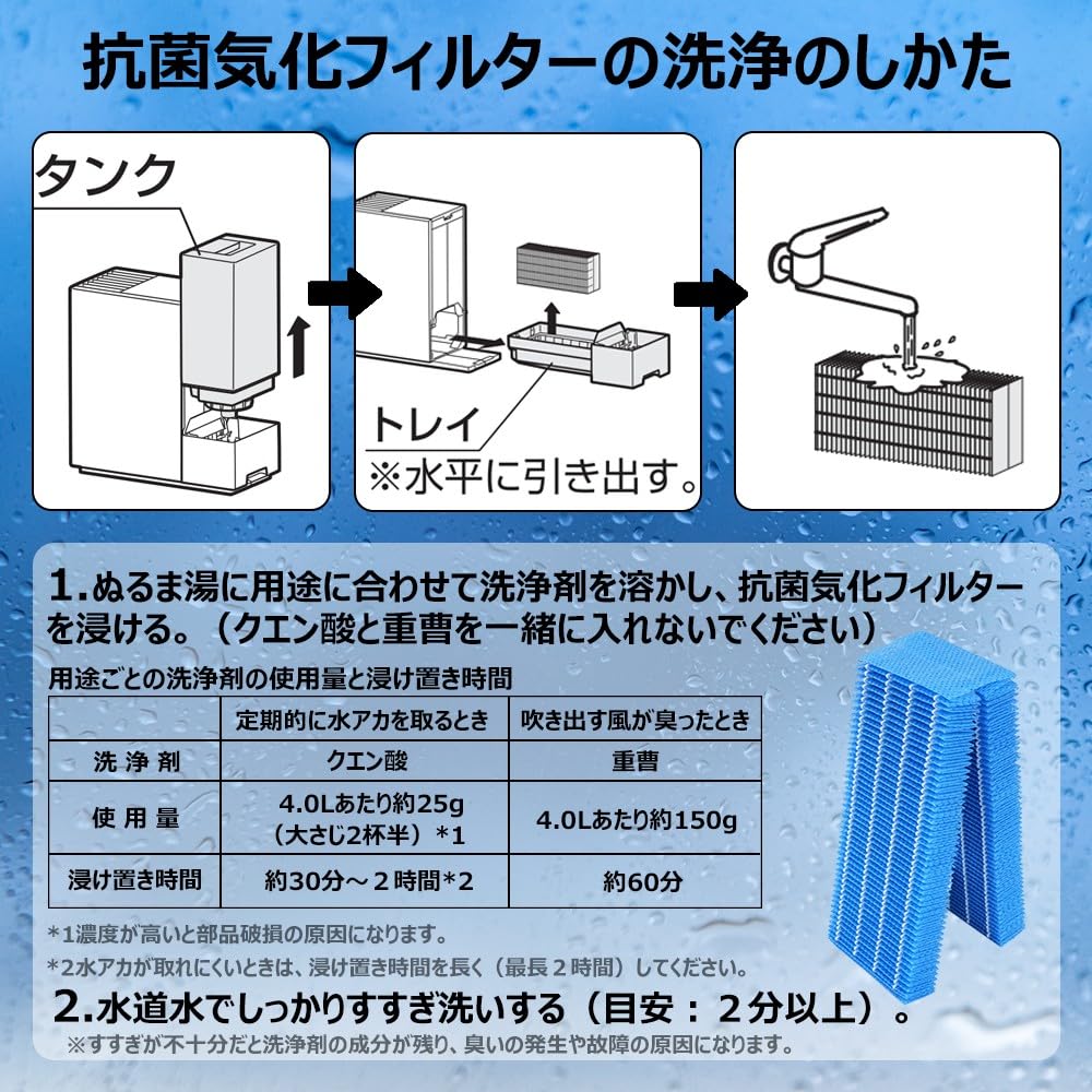 [Техническое обслуживание] Увлажняющий фильтр H060518 Примерно раз в две недели растворяйте чистящее средство в теплой воде в соответствии с целью, замочите антибактериальный испарительный фильтр и тщательно промойте водопроводной водой. (примерно 2 минуты или больше). Не смешивайте лимонную кислоту и пищевую соду.. Чистите лимонной кислотой раз в два раза. (примерно раз в месяц). Рекомендуемый интервал замены увлажняющего фильтра составляет примерно 5 сезонов. (6 месяцев в сезон, 8 часов работы в день и очистка лимонной кислотой один раз в месяц). Рекомендуемый срок замены антибактериальной насадки H011500 составляет примерно один сезон.. Крышки баков не являются сменными деталями.. Пожалуйста, не выбрасывайте его.