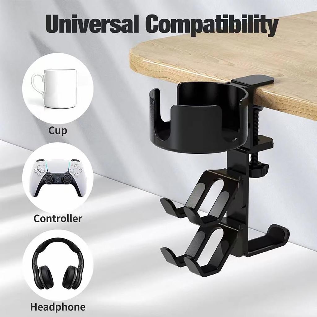 Конструкция 3 в 1 — универсальная конструкция, позволяющая хранить подстаканники, игровые и аудиогарнитуры, а также 2 игровых контроллера в одном месте.. Идеально подходит для всех видов наушников, игровых контроллеров, чашек, мобильных телефонов и других устройств.. Вы можете аккуратно организовать свой рабочий стол.