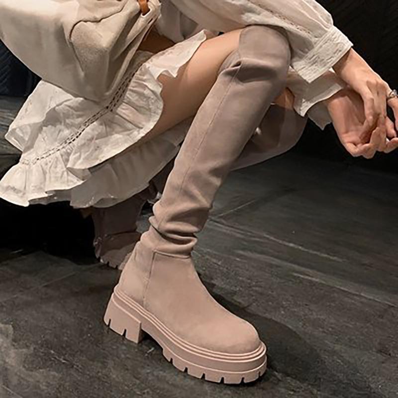 Женские туфли на плоской подошве на платформе, плиссированные сапоги «Челси» выше колена, зимние замшевые сапоги, высокие готические ботинки