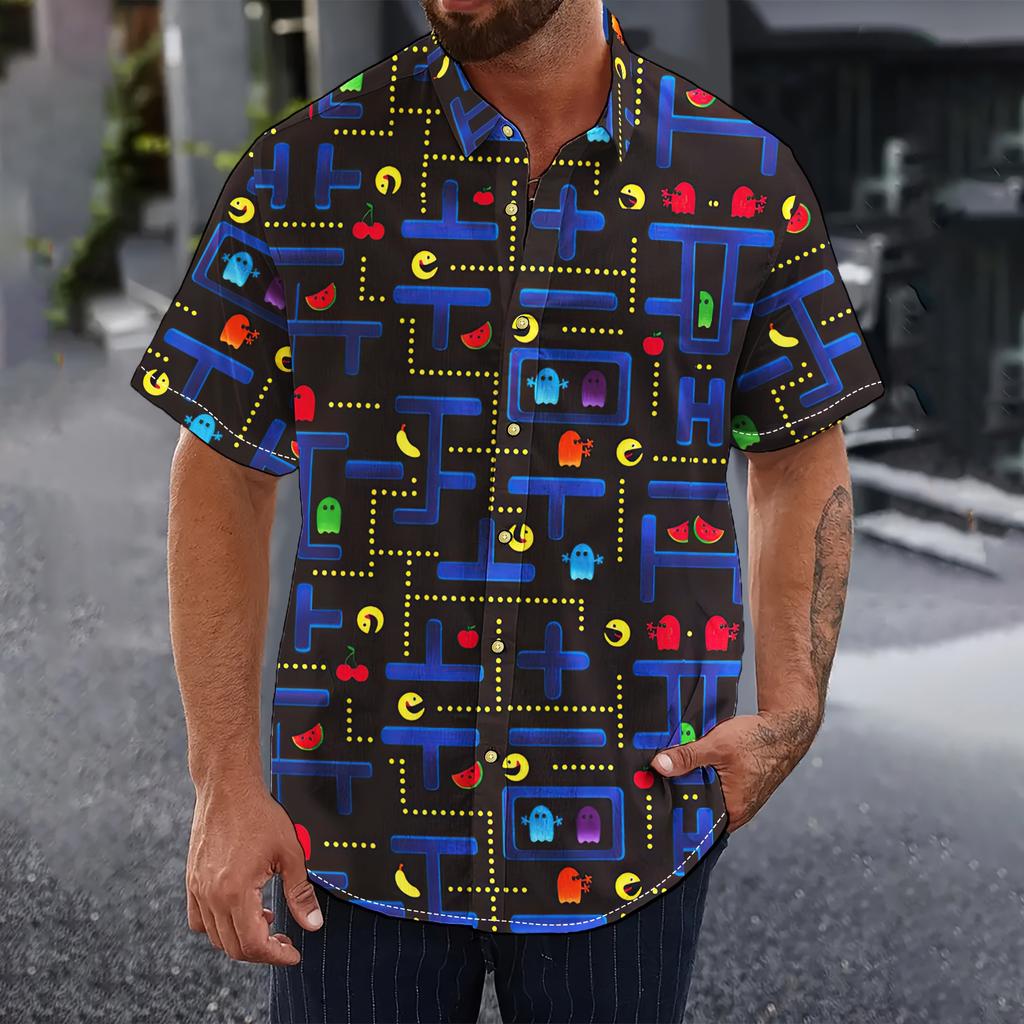 Летняя мужская рубашка с рисунком в виде мультфильма, повседневная рубашка с коротким рукавом и лацканами, модные топы для мужчин, свободная одежда