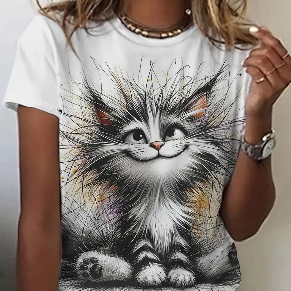 Футболка с круглым вырезом и принтом мохнатого кота, женская, весенне-летняя, с короткими рукавами, повседневная, легкая, в уличном стиле, персонализированная футболка