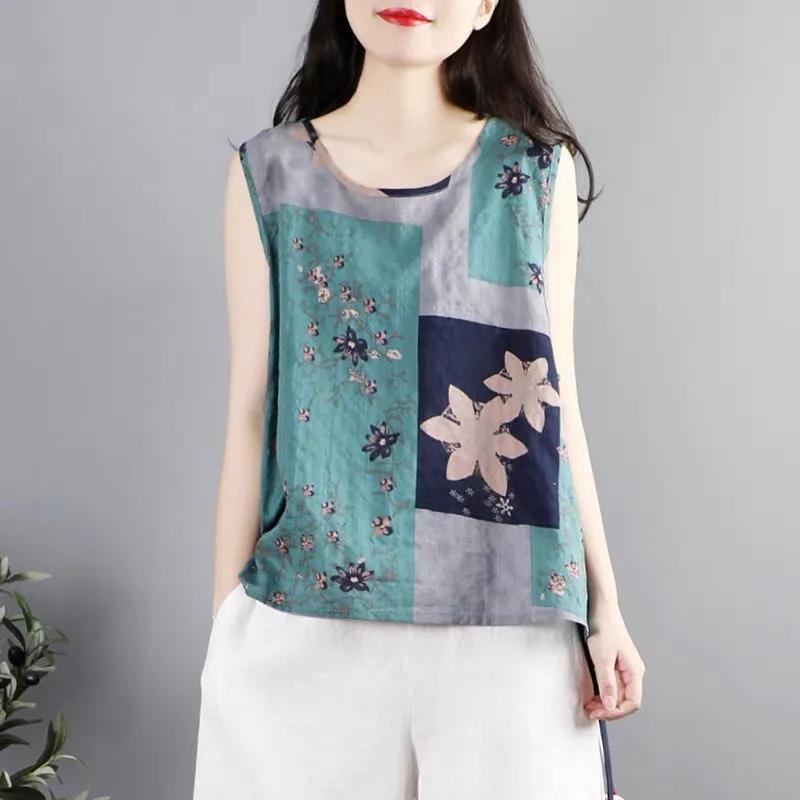 Женский жилет в этническом стиле из хлопка и льна в стиле ретро с литературным мотивом, топ без рукавов с цветочным принтом в китайском стиле на пуговицах