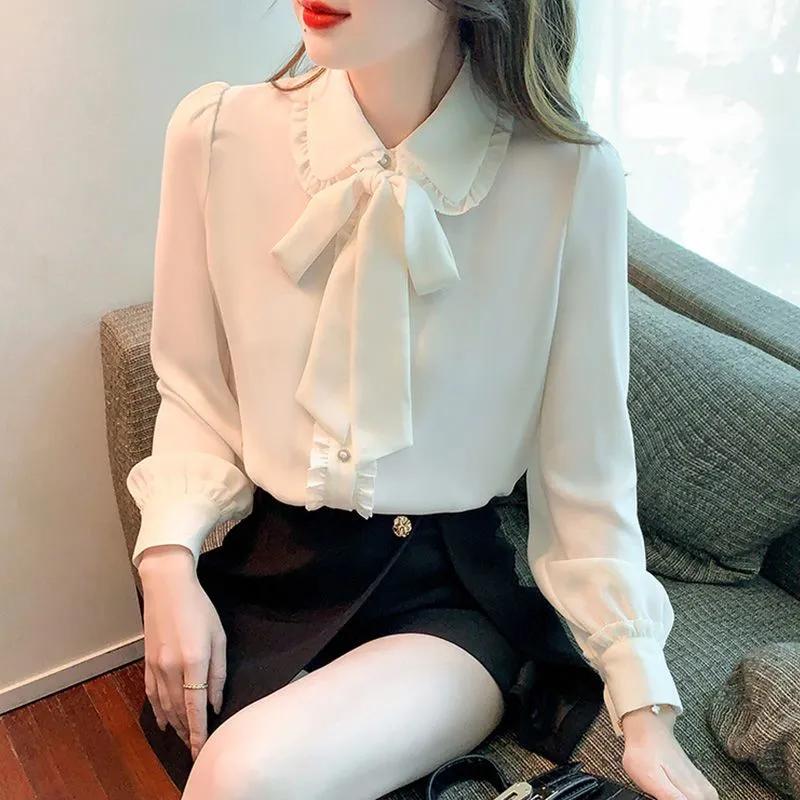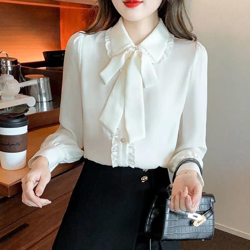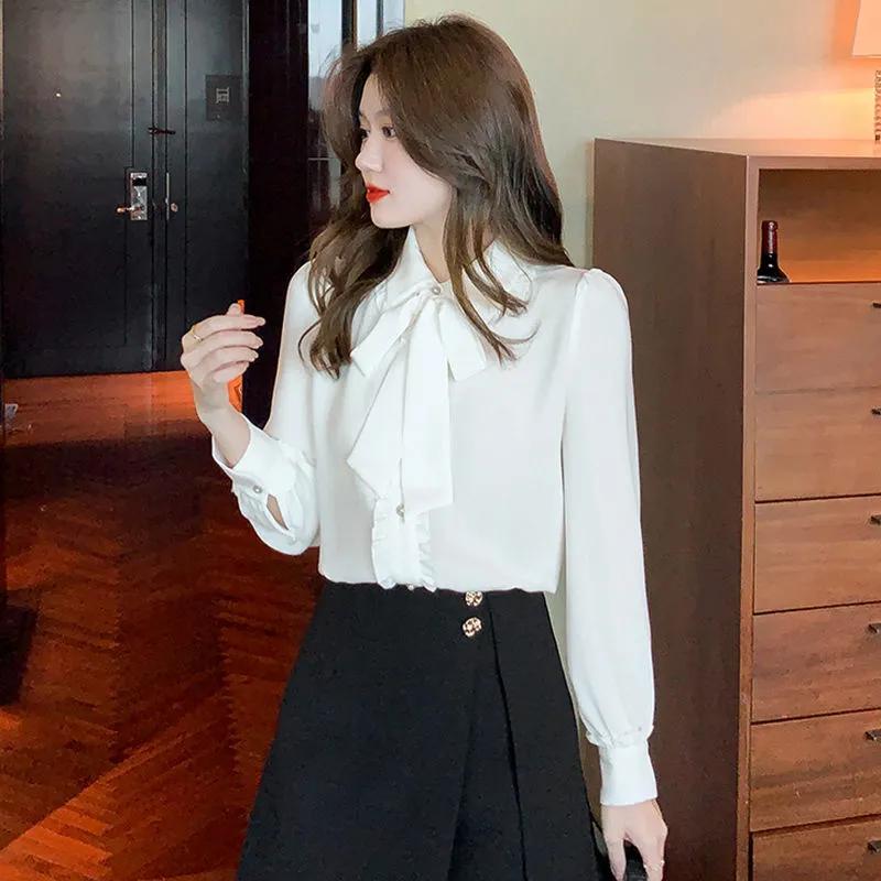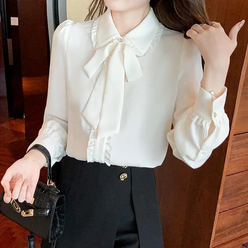 Рубашка с длинными рукавами и бантом Женская одежда на весну и осень Корейская версия блузки The Niche Design Sense Свободная шифоновая рубашка в стиле темперамент