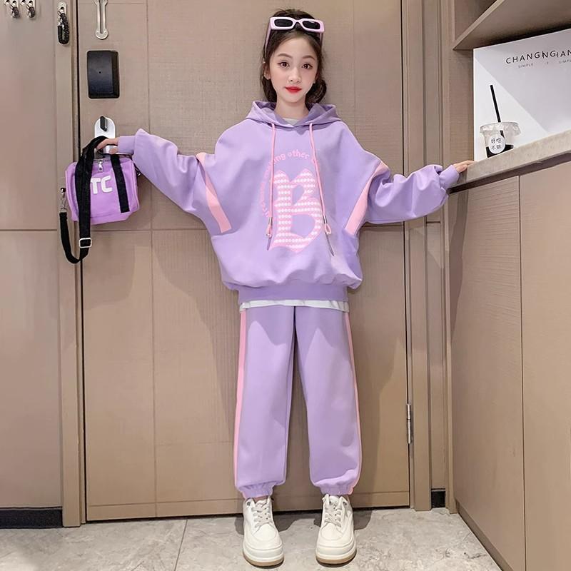 Комплект одежды для девочек-подростков на весну и осень, детские толстовки с капюшоном для девочек, свитер с длинными рукавами и штаны с полосками по бокам, комплект из двух предметов, детский спортивный костюм с надписью