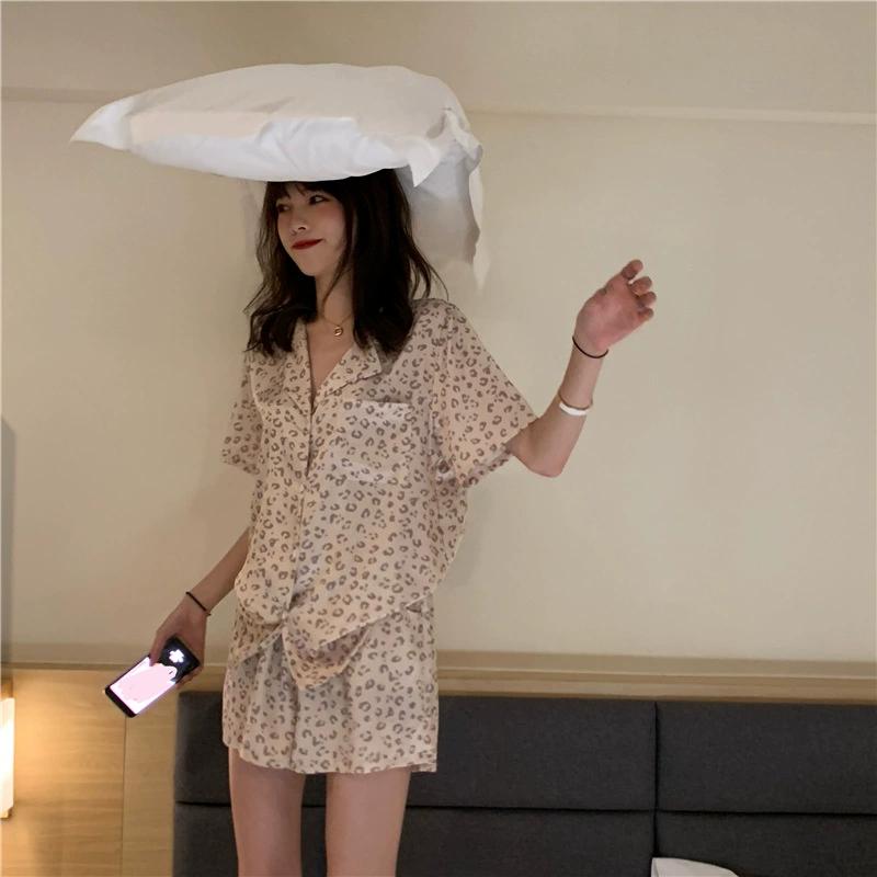 Весна и лето Тонкий двухсекционный женский пижамный костюм с короткими рукавами и кардиганом с лацканами для домашнего использования
