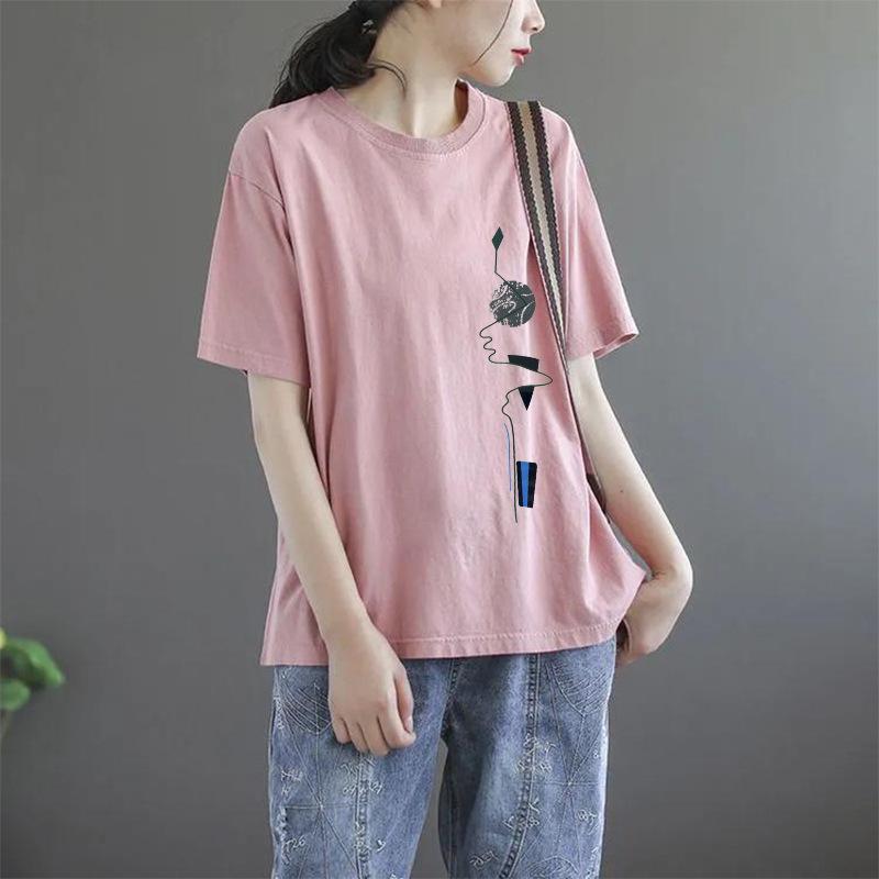 Короткие рукава женские летние корейские круглые вырезы с геометрическим принтом большой свободный свитер повседневные футболки топы