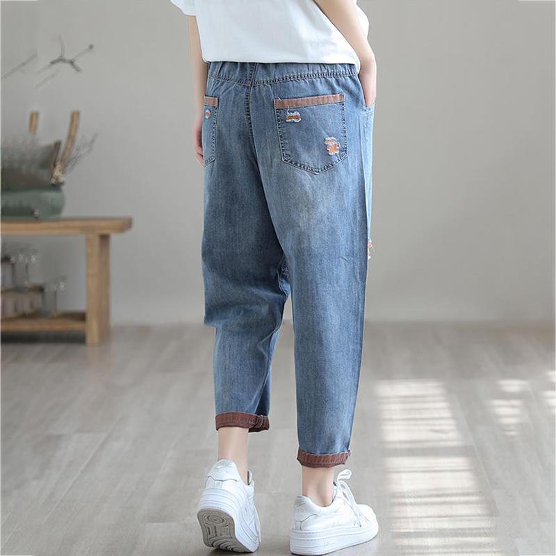 Женские летние тонкие джинсы с дырками Nine-minute с эластичной талией, свободные повседневные шаровары