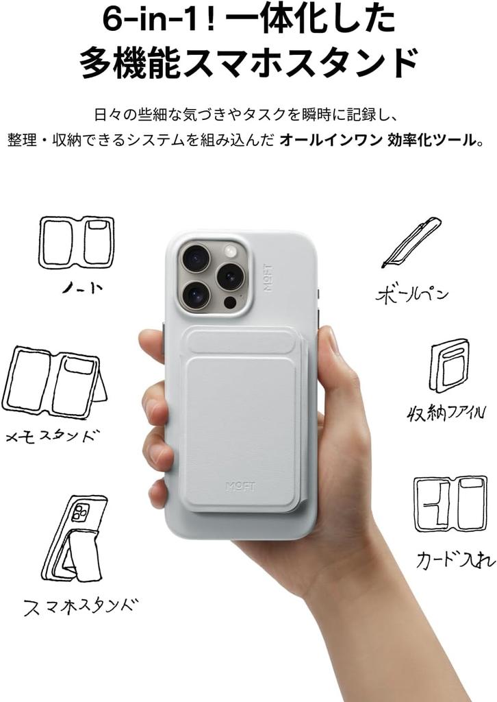 [Раскройте свой творческий потенциал с многофункциональным дизайном 6-в-1] Оснащен 6 функциями в одном устройстве: блокнот, подставка для заметок, подставка для смартфона, держатель для карт, файл для хранения и шариковая ручка. Благодаря новейшей конструкции, развертывание на стенде может быть выполнено мгновенно.. Кроме того, он имеет сверхлегкую конструкцию толщиной 7,5 мм и весом 62 г, что делает его невероятно портативным в качестве подставки для смартфона с высококачественной шариковой ручкой и прикрепленной бумагой.. Универсальный инструмент, сочетающий в себе дизайн и практичность.