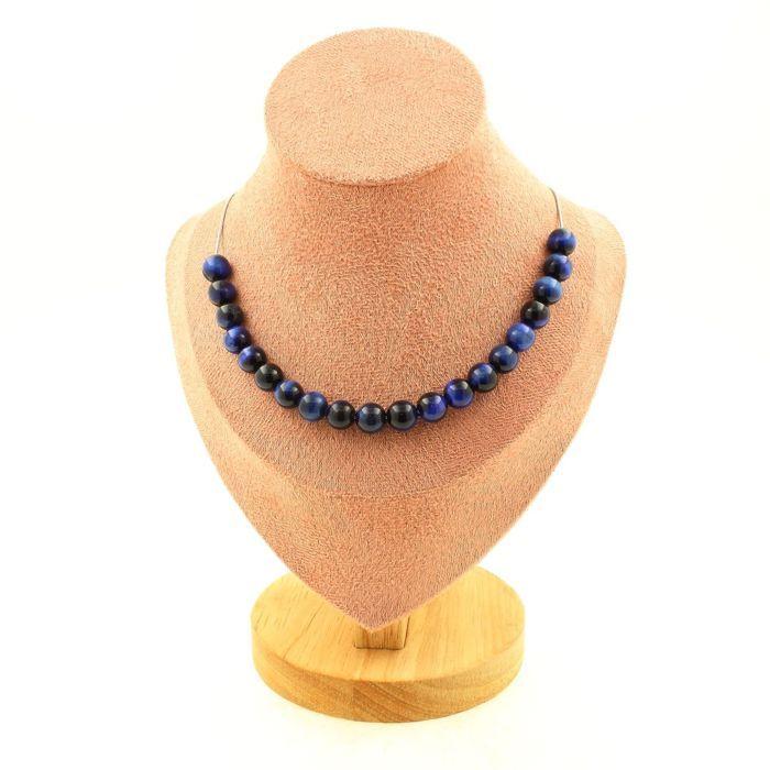 Pierres et Minéraux. Collier 20 perles Oeil de Tigre Bleu 8 mm. Chaine en acier inoxydable Collier femmes, hommes. Taille personnal