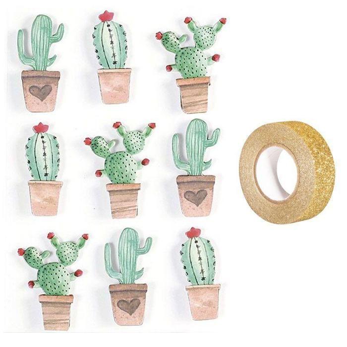 9 stickers 3D Cactus mexicains 4,5 cm + masking tape doré à paillettes 5 m