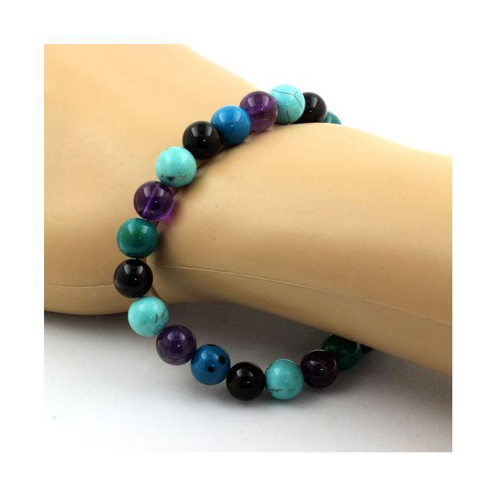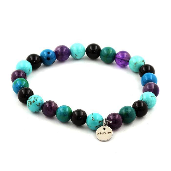 Pierres et Minéraux. Bracelet Perles Améthyste + Chrysocolle + Agate noire + Turquoise 8 Fabriqué en France.