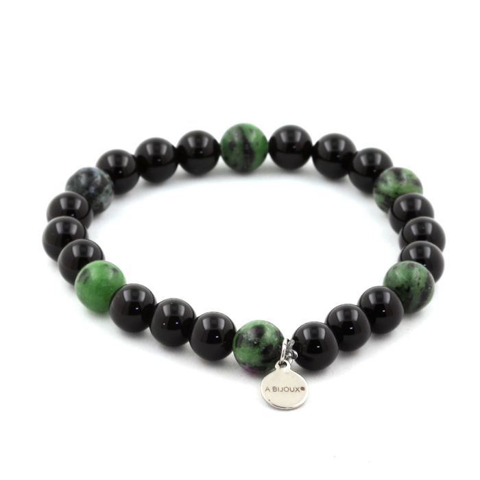 Pierres et Minéraux. Bracelet Perles Agate noire + Epidote d'Australie 8 mm. Fabriqué en France.