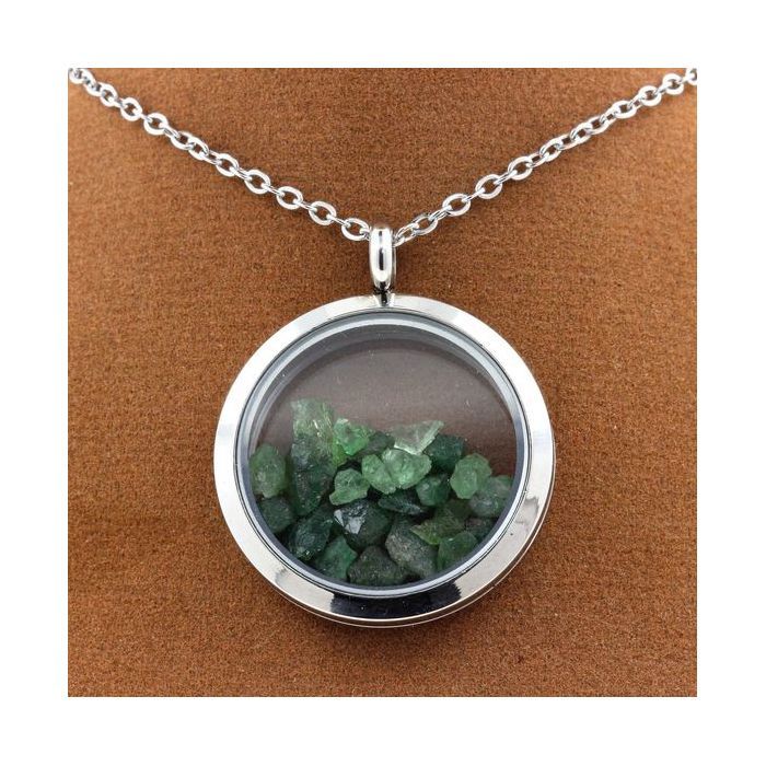 Pierres et Minéraux. Collier Grenat Tsavorite brut. Modèle Médaillon 30 mm. Couleur Argent.