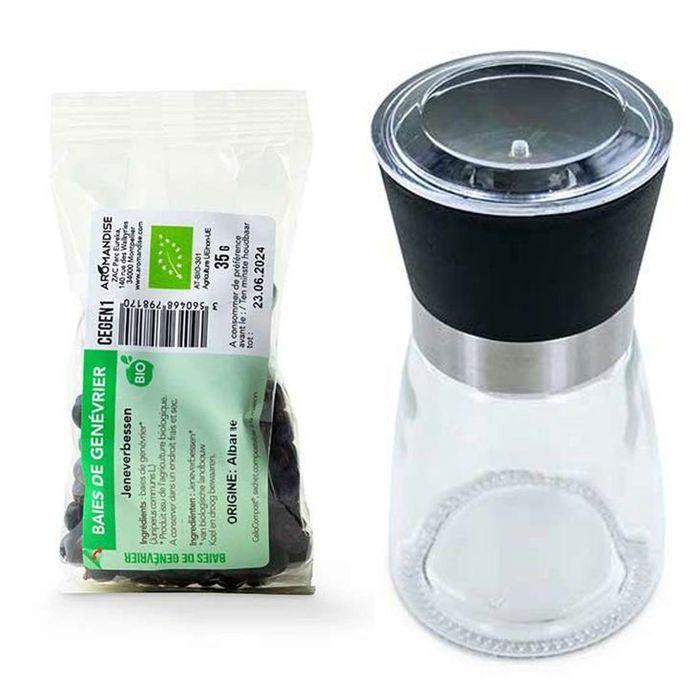 Moulin à épices en verre et céramique + baies de genévrier bio