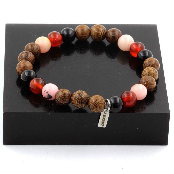 Pierres et Minéraux. Bracelet Perles Opale Rose + Agate noire + Agate Rouge + bois 8 mm. Fabriqué en France.