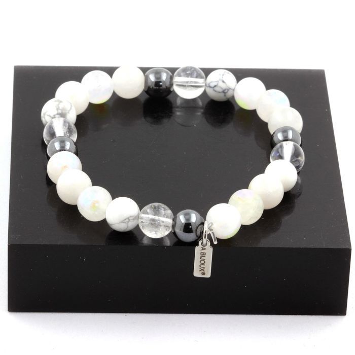 Pierres et Minéraux. Bracelet Perles Hématite + Quartz + Pierre de lune + Howlite 8 mm. Fabriqué en France.