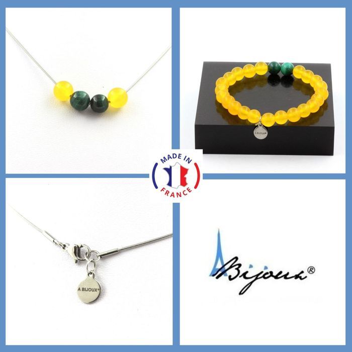 Pierres et Minéraux. Parure Bracelet Collier perles Agate jaune + Malachite du Congo 8 mm. Taille personnalisable.