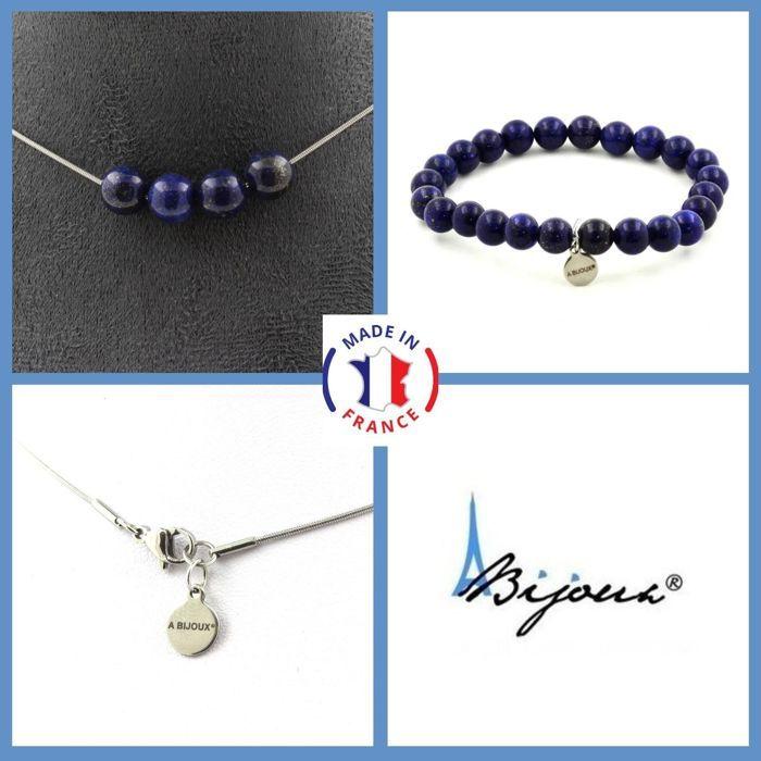Pierres et Minéraux. Parure bijoux Bracelet Collier 5 Perles Lapis Lazuli 8 mm. Chaine en Taille personnalisable.