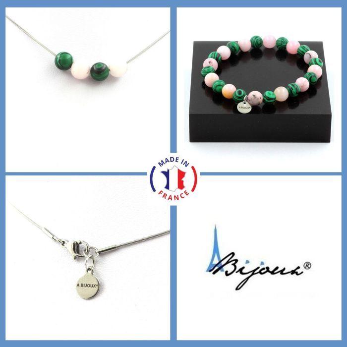 Pierres et Minéraux. Parure Bracelet Collier Perles Opale Rose + Malachite 8 mm. Chaine en Taille personnalisable.