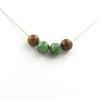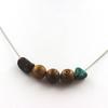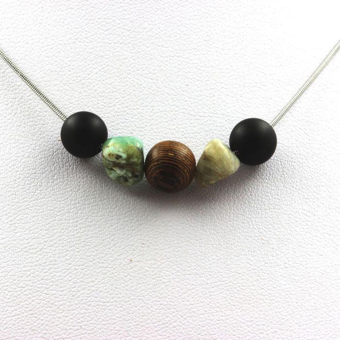 Pierres et Minéraux. Collier perles bois + Onyx noir mat 8 mm + Opale multicolore Chaine en acier inoxydable.
