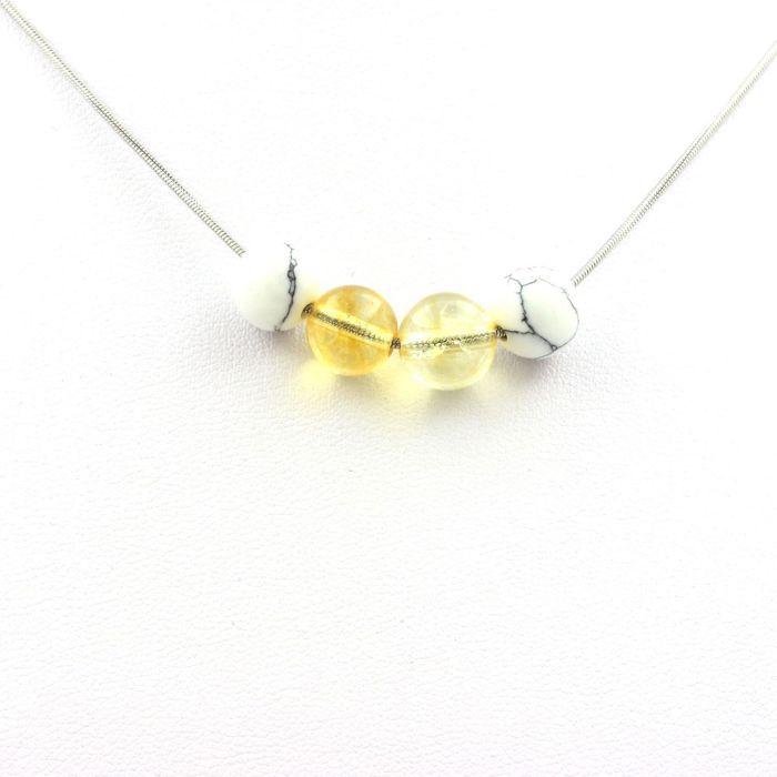 Pierres et Minéraux. Collier 4 perles Citrine + Howlite 8 mm Chaine en acier inoxydable.
