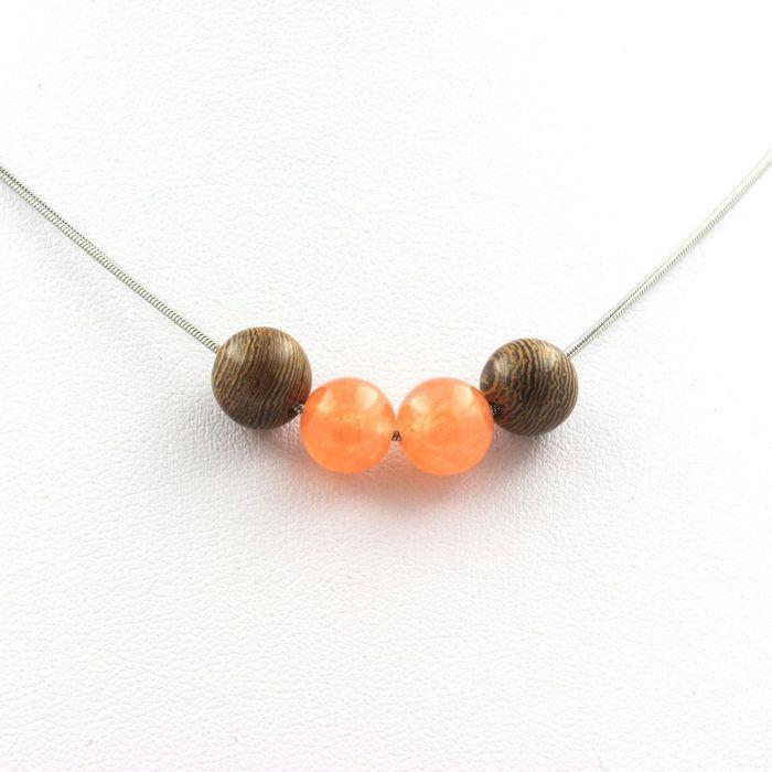 Pierres et Minéraux. Collier perles bois + Calcédoine orange 8 mm Chaine en acier inoxydable.
