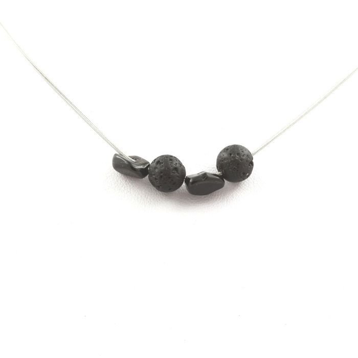 Pierres et Minéraux. Collier perles Lave + Tourmaline Schorl du Brésil 8 mm Chaine en acier inoxydable.
