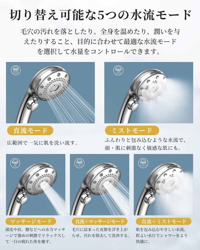 [5-уровневый режим подачи воды и функция ручной остановки]: 5 режимов воды: режим дождя, режим дождя + массажа, режим массажа, режим тумана, режим тумана + дождя. Режим «Дождь», когда вы хотите смыть грязь с кожи головы. Режим распыления используется, когда вы хотите бережно очистить лицо и деликатные участки, не вызывая раздражения и прикосновения.. Режим массажа, когда вы хотите снять усталость плеч и поясницы. Вы можете наслаждаться более эффективным и комфортным принятием душа, используя различные режимы подачи воды в зависимости от части тела.. Кроме того, это очень удобно, так как вы можете легко включать и выключать его, просто нажав кнопку остановки подачи воды.. Благодаря функции остановки подачи воды одним нажатием и функции регулировки напора воды вы можете перекрыть воду одним нажатием, не открывая и не закрывая кран, что эффективно сокращает ваши счета за воду в долгосрочной перспективе.. ▲Вода временно остановлена, поэтому, пожалуйста, не выключайте воду надолго с помощью выключателя.. После принятия душа обязательно выключайте воду, повернув кран, а не выключатель.