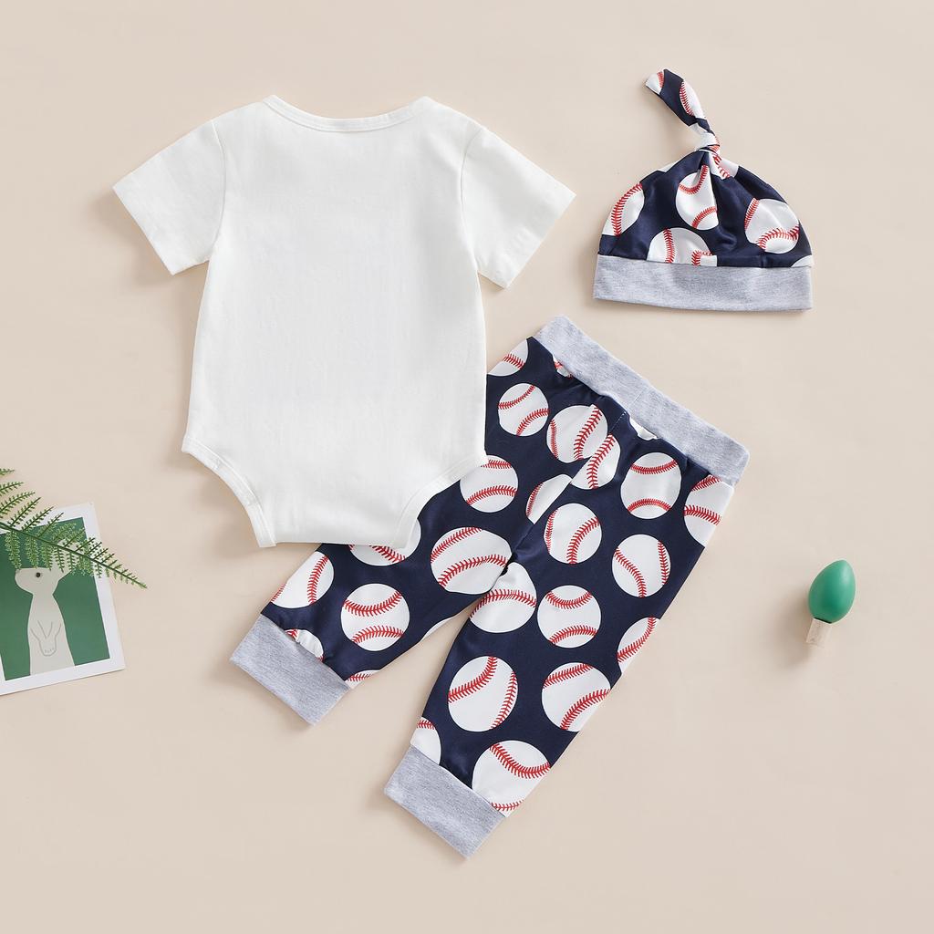 Детские летние комплекты из 3 предметов, комбинезон с коротким рукавом и принтом бейсбольной буквы + брюки + шапочка с узлом
