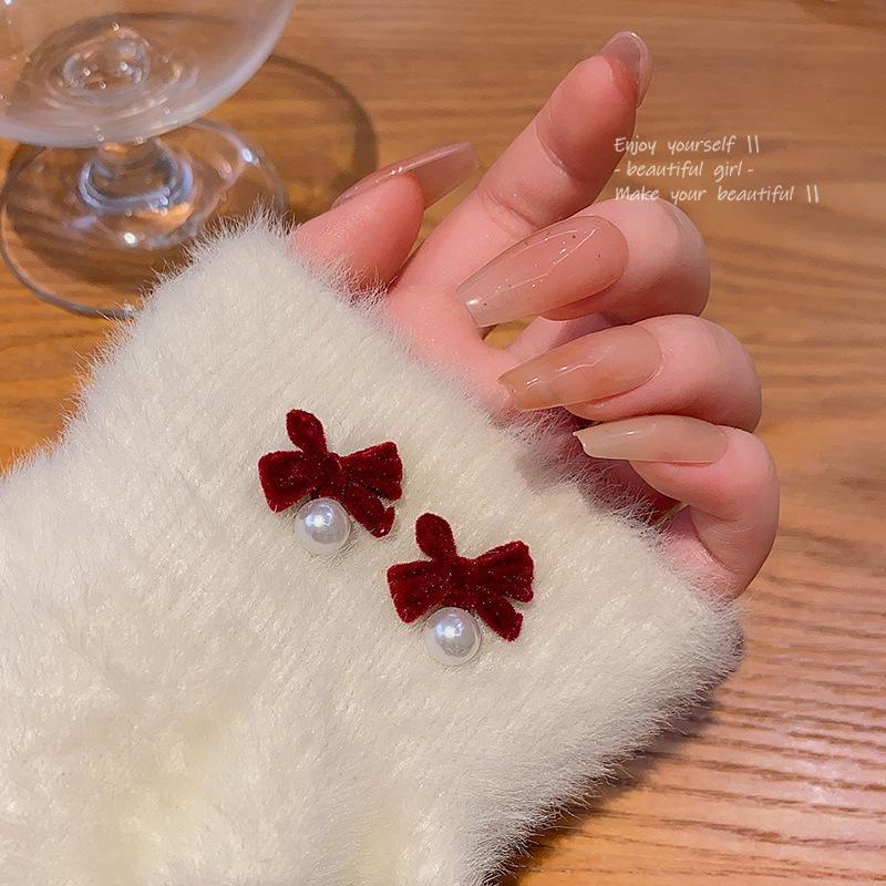 Серьги с жемчугом в виде бархатного банта: Серебряная игла 925 пробы, модные осенне-зимние универсальные украшения с флокированием