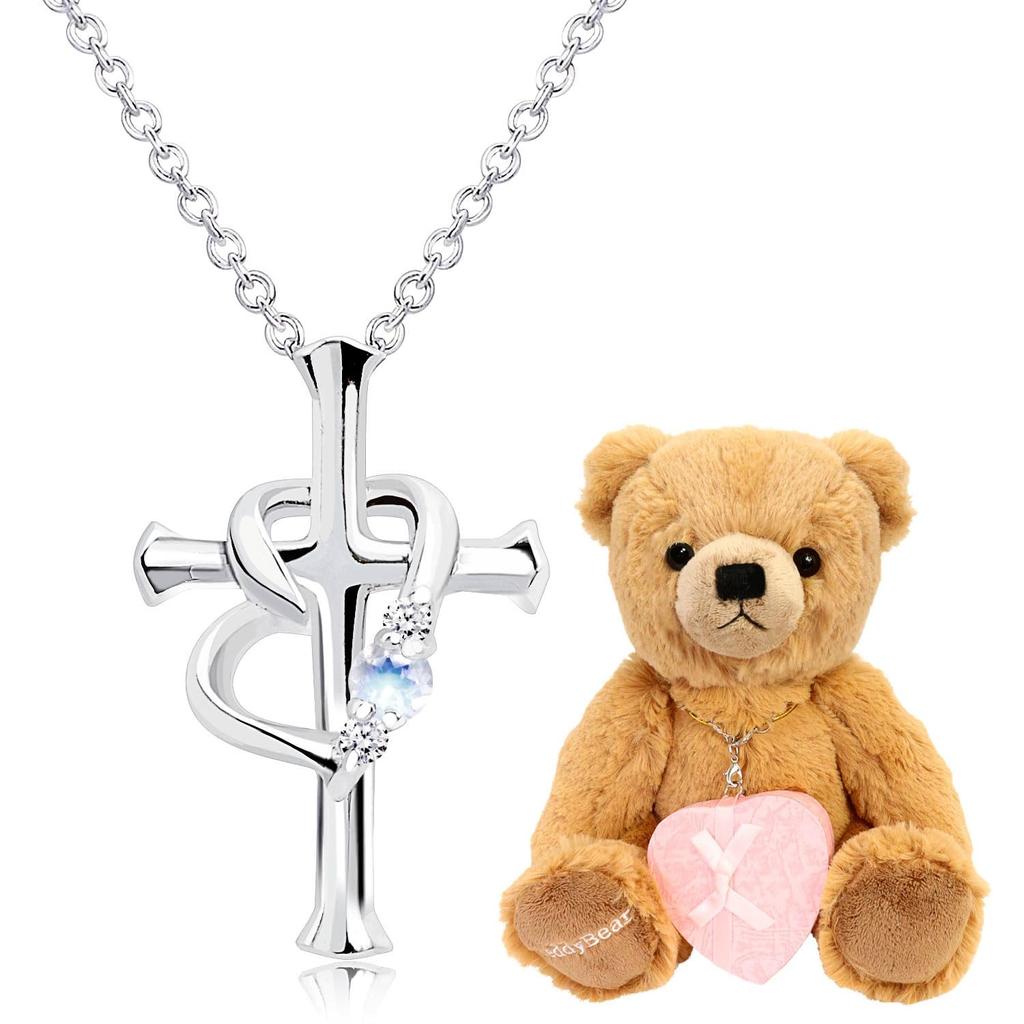 Популярное ожерелье с крестообразным мотивом украшено вечно любимым натуральным бриллиантом и 12-м камнем рождения и будет доставлено вместе с милым плюшевым мишкой.