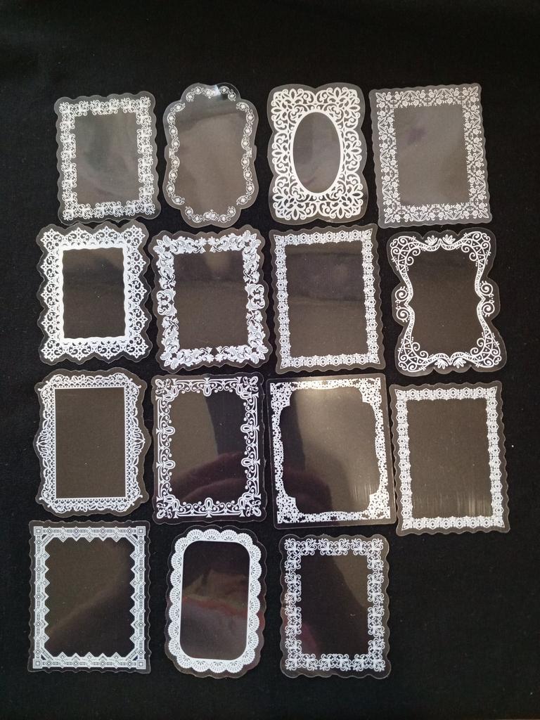 Наклейки в виде рамок . Именно эти хорошо заметны только на чёрном фоне или на очень темном. Пока не использовала. 15 видов по 2 штуки.